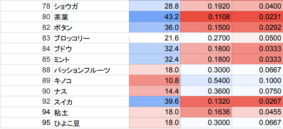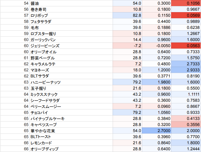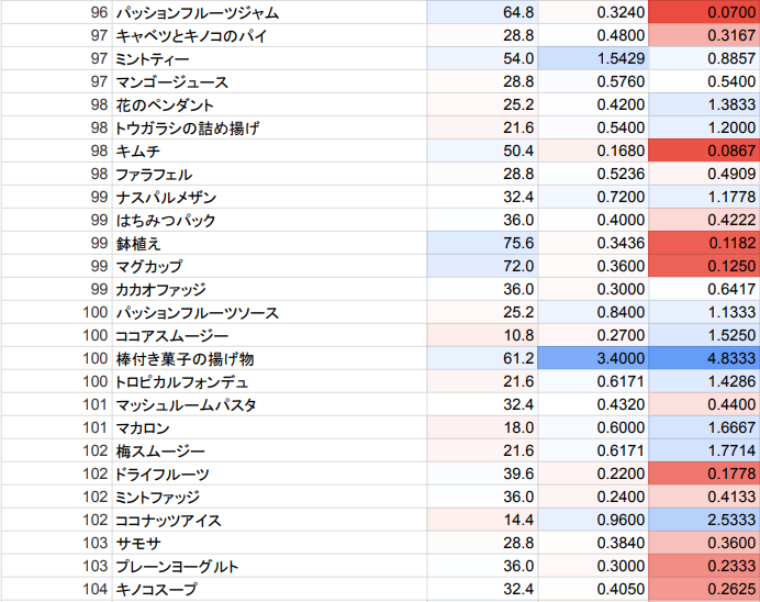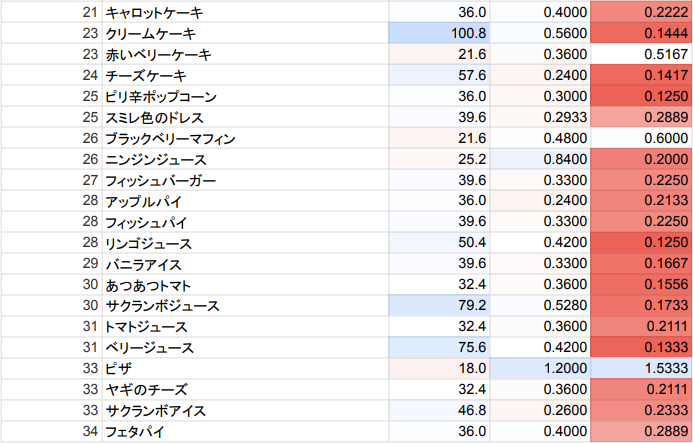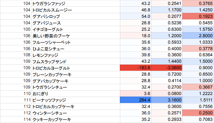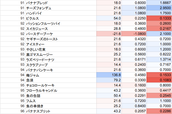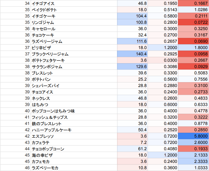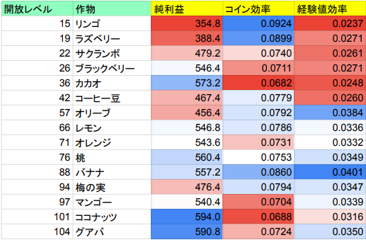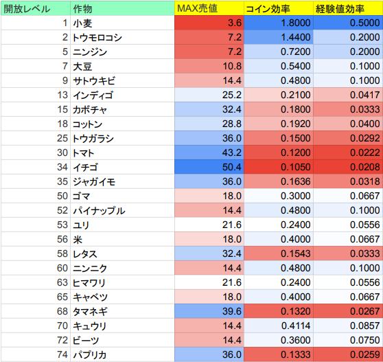 ゲーム内に登場する各アイテムのコイン効率、経験値効率を表にまとめました。